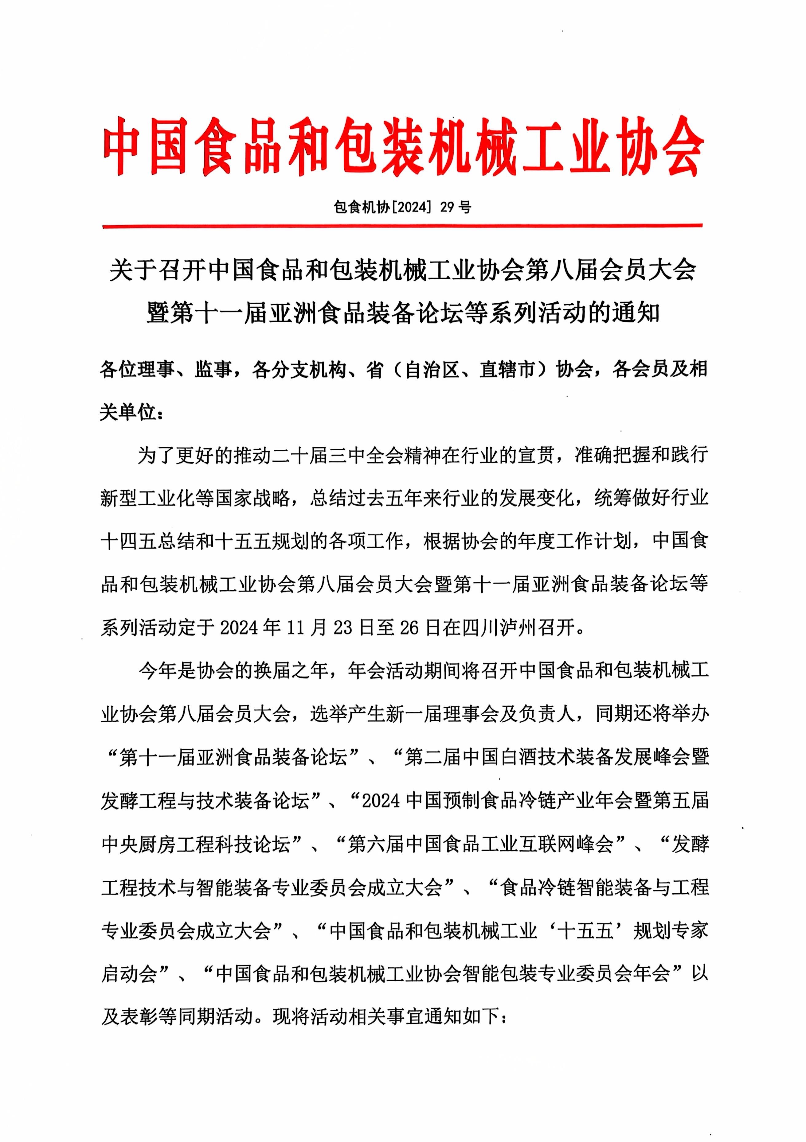 關(guān)于召開中國(guó)食品和包裝機(jī)械工業(yè)協(xié)會(huì)第八屆會(huì)員大會(huì)暨第十一屆亞洲食品裝備論壇等系列活動(dòng)的通知
